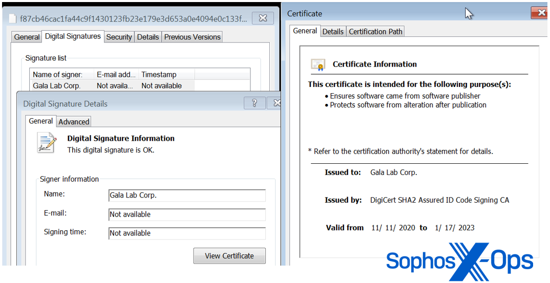 The installer provided another surprise: It was digitally signed. The signature belongs to Gala Lab Corp., a Korean online game developer company. Even though the signature has expired, it checks as valid if the system clock is set back to before the expiration date in early 2023.