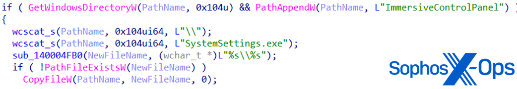 Interestingly, the clean loader (SystemSettings.exe) is not part of the installer package. Instead, because it is a standard component, it can be grabbed from its legitimate location (%WINDOWS%\ImmersiveControlPanel) and copied along with the malicious sideloading components.