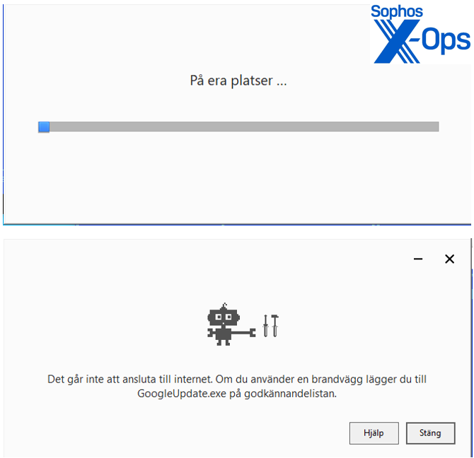 Figure 9: The installation attempting to be inconspicuous in Swedish. (The load screen above is fairly self-explanatory; the lower screen says “Unable to connect to the Internet. If you are using a firewall, add GoogleUpdate.exe to the approval list  [whitelist]”)