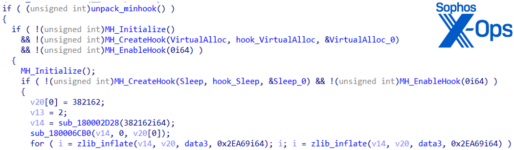 The memory dump contains two compressed images; when unpacked, one is a Minhook DLL, the other is a Cobalt Strike beacon. It loads SyncRes.dat (see next section), then locates and calls the StartEngineData export. After loading the Minhook DLL it will use it to hook the following API functions: