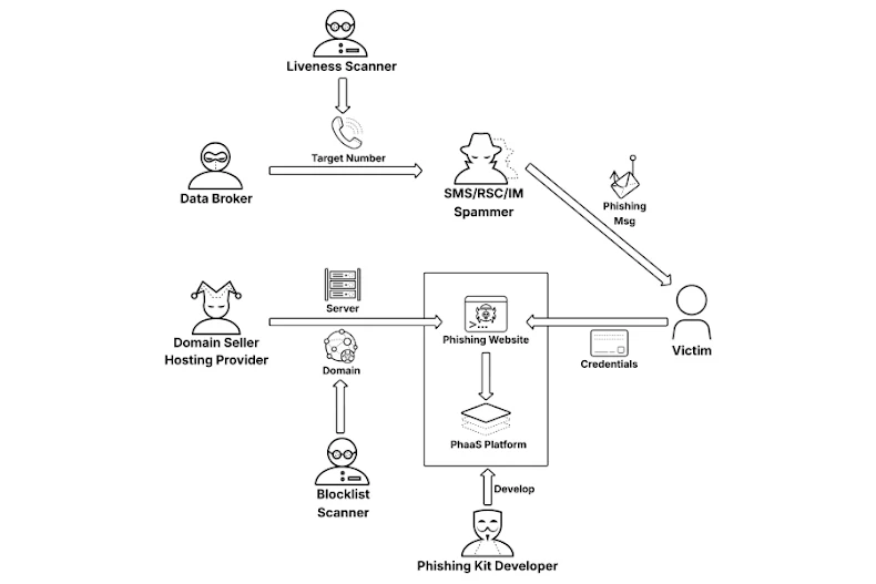 This includes phishing kit developers, data brokers (who sell target phone numbers), domain sellers (who register disposable domains for hosting the phishing sites), hosting providers (who provide servers), spammers (who deliver the messages to victims at scale), liveness scanners (who validate phone numbers), and blocklist scanners (who check the phishing domains against known blocklists for rotation).