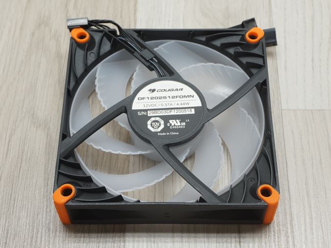 The cooler is equipped with three 120 mm fans that feature a unique frame design, blades with convex ridges, and an advanced hydraulic bearing for improved performance and durability. Although the specific original manufacturer of the fans is not disclosed, the part number is DF1202512FDMN. These fans are outfitted with ARGB LEDs and have a semi-transparent blade and inner ring assembly, which is designed to diffuse the lighting softly, enhancing the overall aesthetic appeal of the cooler.