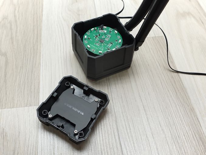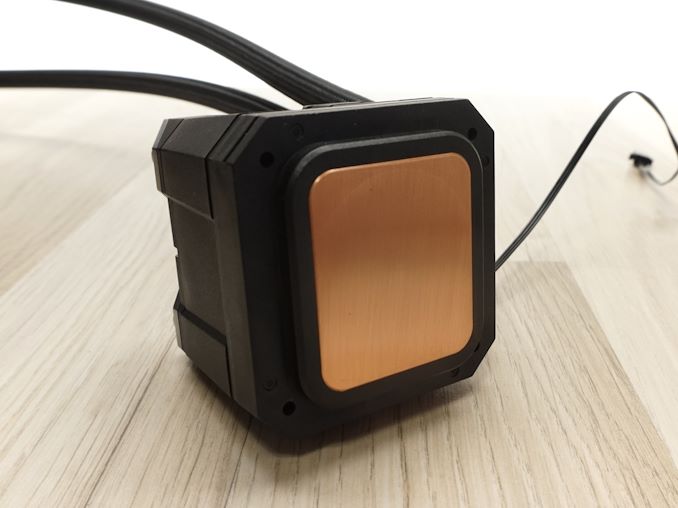 The main block assembly features a squircle-shaped metallic contact plate made of copper. The plate is not machined to a mirror finish but it is smooth and flat enough. The designer hid the screws holding the cold plate in place behind the plastic cover. No thermal compound is pre-applied, giving users the option to use their preferred thermal paste. The contact plate is large enough for all the processors this cooler is compatible with.